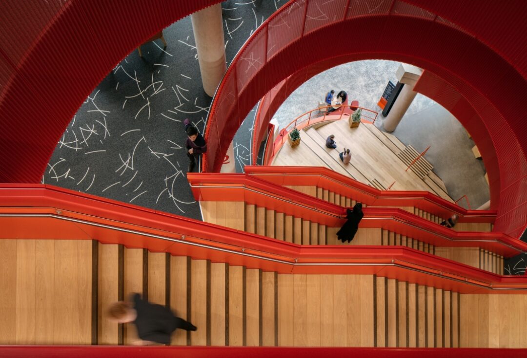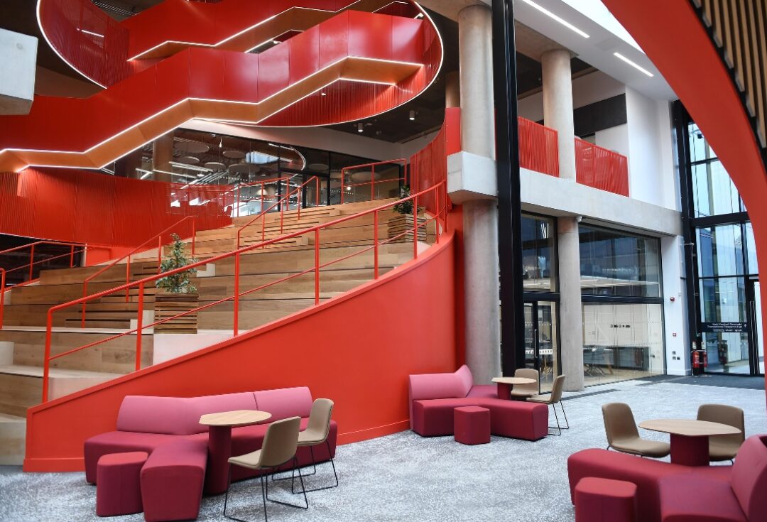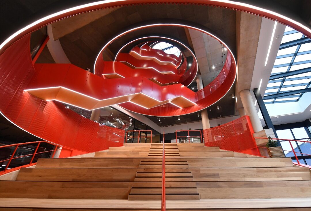 The buildings are located on the university’s cutting edge Innovation Campus, which aims to bring together a range of disciplines to foster collaboration and ingenuity. To facilitate this engagement, the highly complex Oculus staircase located at the heart of the sbarc building and a first of its kind in the UK, seemingly travels upwards through a slanting void. The neighbouring TRH is home to two world leading scientific research establishments – the Institute for Compound Semiconductors and Cardiff Catalysis Institute – comprising cleanrooms, bespoke laboratories, and a microscopy suite