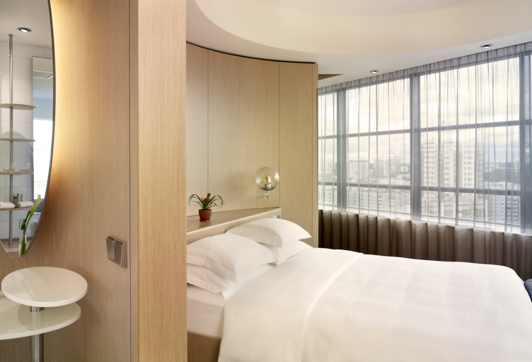 The first 5 star hotel in the Russian city of Ekaterinburg, the Hyatt Regency is located in the city center, facing the golden domes of the Romanov Cathedral, very close to the new Ekat City. The design of the Hyatt Regency hotel built in 2009 is inspired by the tradition of ice sculptures. Its shape of giant ice cube follows the curve of the lake as its glass facade seems. In the center of a future 12 ha business district, it offers 296 rooms, a ballroom for 800 people and the largest multi-purpose congress center in the city. Served by the Trans-Siberian Railway and the second largest economic center in Russia, the capital of the Urals is booming. And nothing is too good for this hotel: the company, for example, uses innovative decorative materials such as corian, which provides a particularly elegant surface finish.