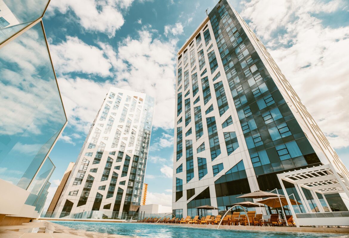 The two 25-storey towers, on the roof of which is the swimming pool, host a panoramic bar and a breathtaking view of the sea.